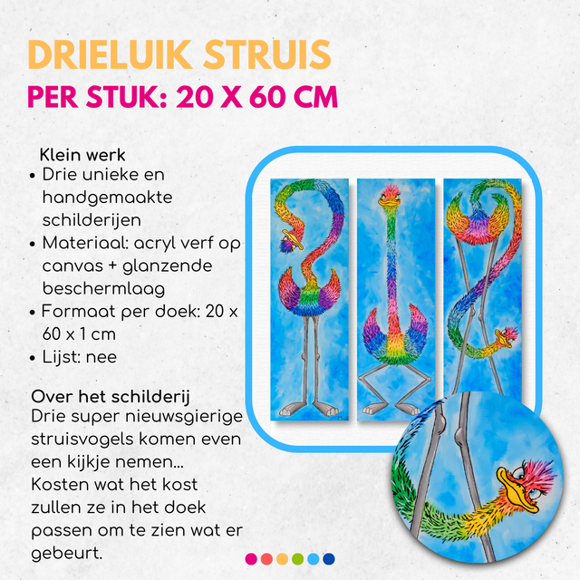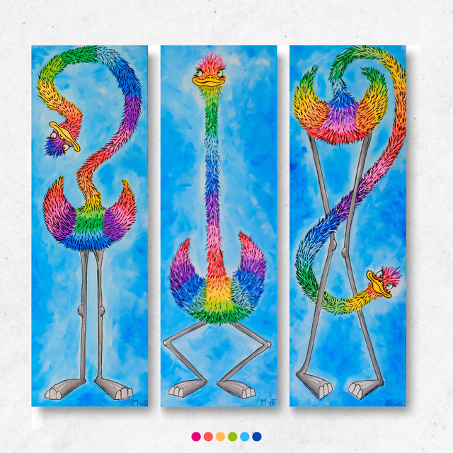 3 struisvogels op een rijtje, maar ze passen niet helemaal op het doek, of toch wel? Dit kleurrijke trio wringt zich in allerlei bochten om erbij te zijn!