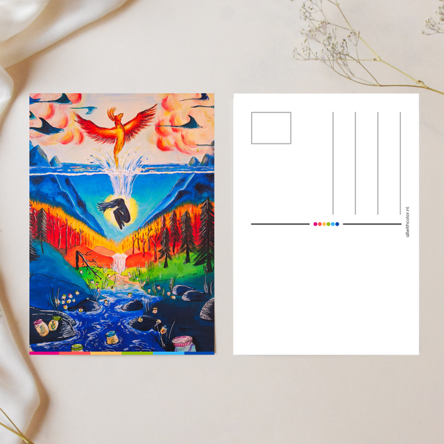 Print van mijn kleurrijke Fenix schilderij op een ansichtkaart