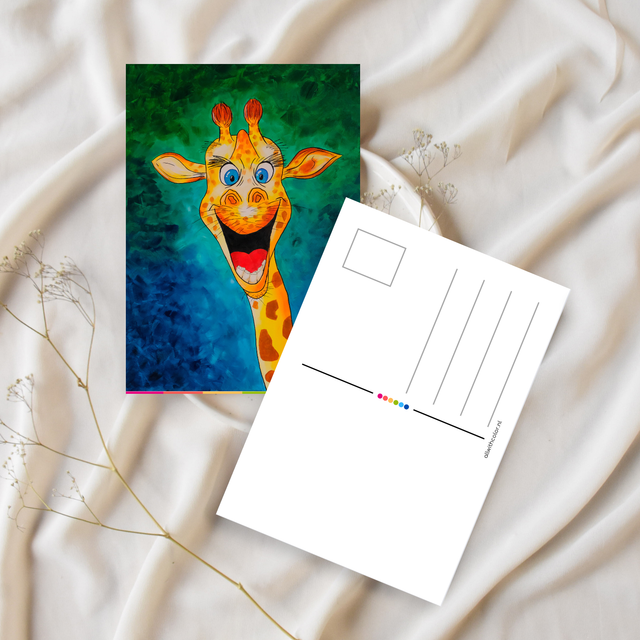 Print van mijn kleurrijke Giraffe schilderij op een ansichtkaart