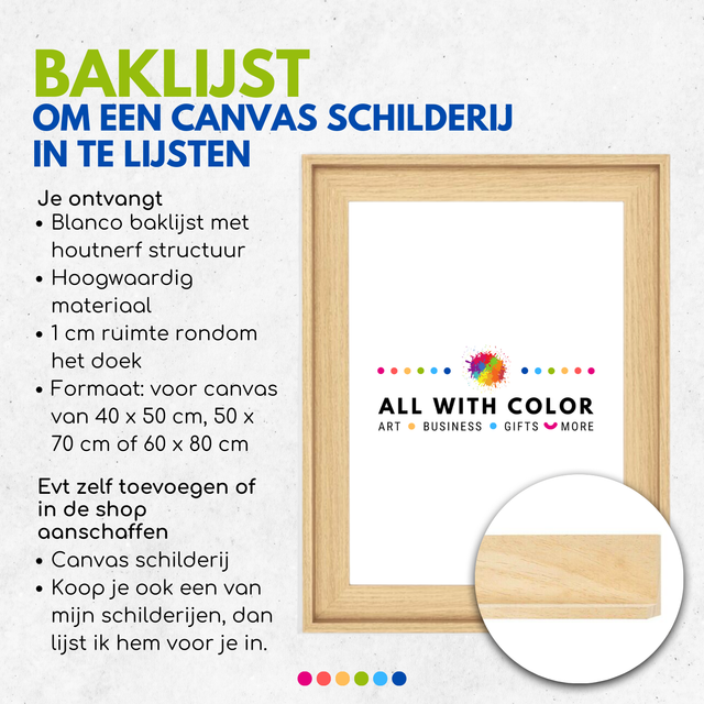 Op zoek naar een schilderij om in te lijsten? Kijk op allwithcolor.nl/art en neem contact met mij op voor jouw unieke schilderij.