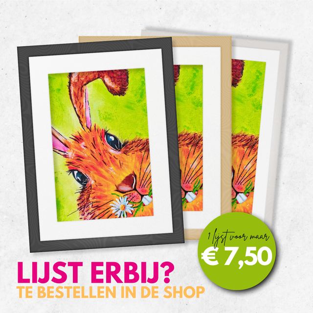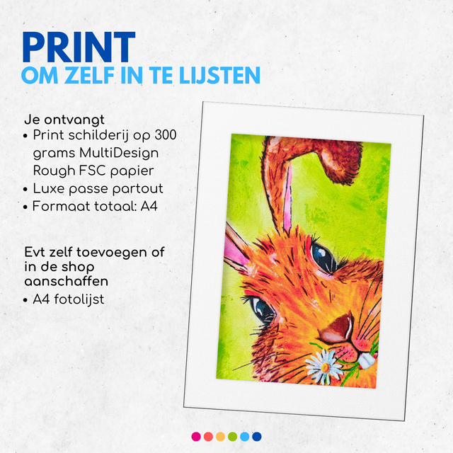 Print van mijn kleurrijke Konijn schilderij met luxe passe partout om zelf in te lijsten.