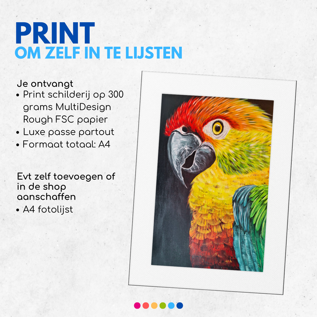 Print van mijn kleurrijke Papegaai schilderij met luxe passe partout om zelf in te lijsten.