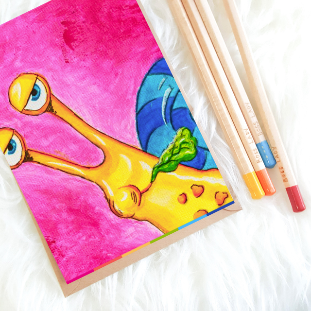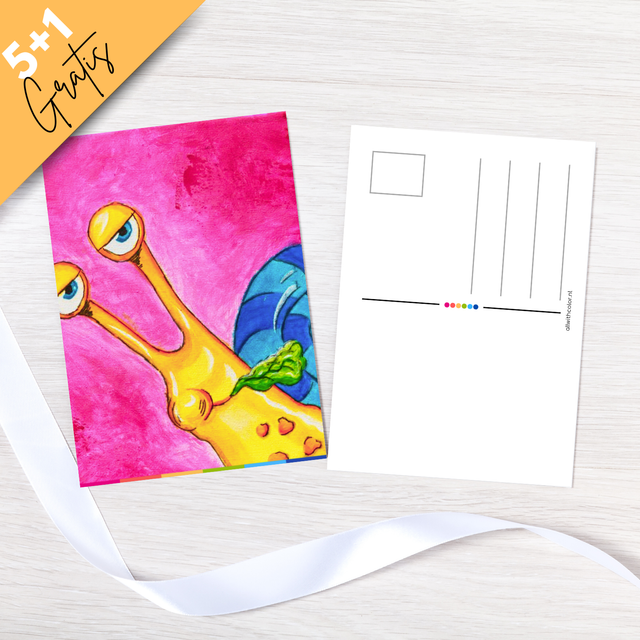 Print van mijn kleurrijke Slak schilderij op een ansichtkaart