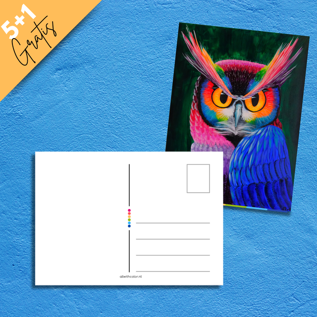 Print van mijn kleurrijke Uil schilderij op een ansichtkaart