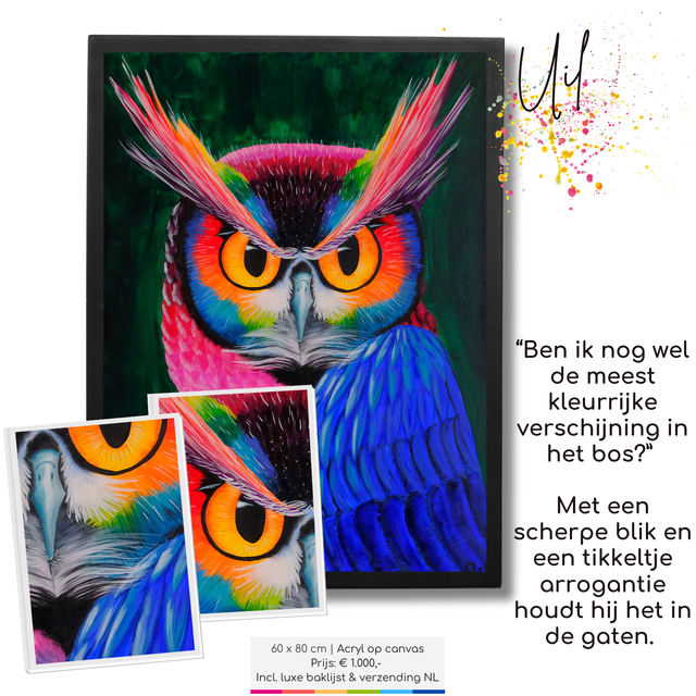 - Materiaal: acryl verf op canvas + glanzende beschermlaag