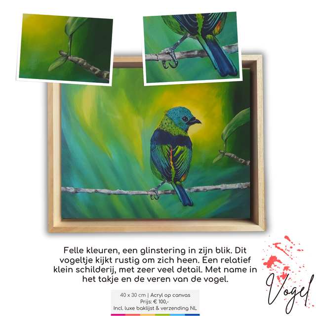 Felle kleuren, een glinstering in zijn blik. Dit vogeltje kijkt rustig om zich heen. Een relatief klein schilderij, met zeer veel detail. Met name in het takje en de veren van de vogel.